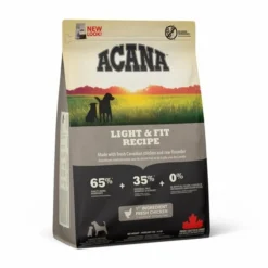 En hund som lagt på sig lite mår bäst av en kost som är rik på proteiner. För att bibehålla muskelmassan men inte skapa onödigt kroppsfett innehåller Acana Light & Fit mycket kött och mindre kolhydrater. Köttet kommer från frigående kyckling och vildfångad flundra. För att främja hälsosamma blodsockernivåer är fodret fritt från högglykemiska ingredienser så som ris, korn och potatis. Istället innehåller det färska lågglykemiska frukter och grönsaker, bland annat pumpa och squash. Fodret ingår i Acanas Heritage-serie. Recepten består av upp till 75 % kött, det är upp till dubbelt så mycket som de flesta specialfoder för hundar, och helt utan växtproteinkoncentrat. En tredjedel av köttet är färskt vilket tillför viktiga näringsämnen medan två tredjedelar torkas för att bli en stark och naturlig källa till köttprotein.