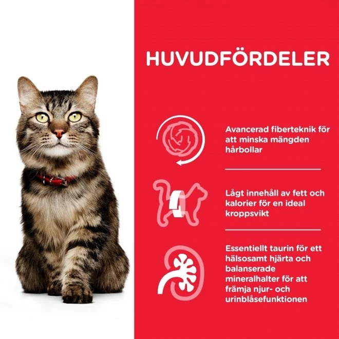 Hill’s Science Plan Cat Mature 7+ Hairball Indoor Chicken är en näringsrik kattmat framtagen för mindre aktiva katter som är sju år eller äldre och som får mycket hårbollar. Kattmaten innehåller naturliga grönsaksfibrer och som vid daglig utfodring påverkar matsmältningssystem så att katten får färre hårbollar. Tillsatt taurin hjälper till att bibehålla en normal hjärtfunktion och syn. Med reglerad fosforhalt som ger friska njurar.