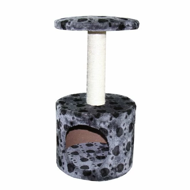 Det snygga klösträdet kombinerar klös, koja och viloplats i ett! Klösträdet är tillverkat av stabila spånskivor, virat sisalrep och mjukt, inbjudande teddytyg. Lynx har ett gulligt mönster av tassavtryck. Mått: 30x30x57cm
