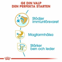 Fodret innehåller en exklusiv kombination av näringsämnen som främjar en sund matsmältning och en balanserad tarmflora vilket i sin tur bidrar till att främja valpens magtarmhälsa. Fodret hjälper även till att hålla valpens idealvikt och bidrar till bra mineralisering av skelettet tack vare ett balanserat intag av energi och mineraler (kalcium och fosfor), vilket stärker benstruktur och leder. En patenterad sammansättning av antioxidanter och prebiotika bidrar till att bygga upp valpens naturliga försvar. Dessutom är foderkulorna specialdesignade för bulldogens käkar och huvudform vilket gör det lättare att plocka upp foderbiten samtidigt som dem uppmuntrar till att tugga ordentligt.