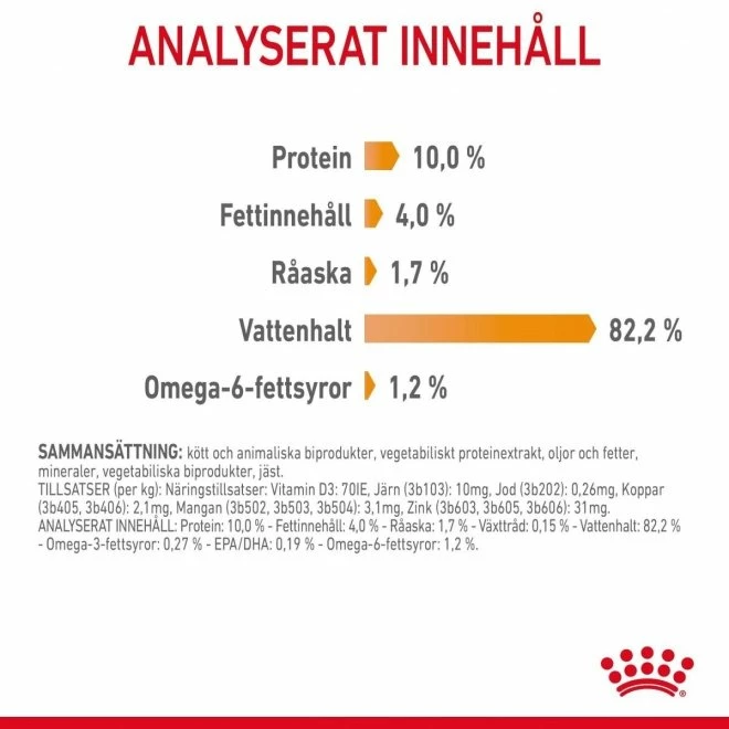 Royal Canin Hair & Skin Care Jelly är ett våtfoder med tunna, välsmakande skivor i gelé. Fodret passar vuxna katter över ett år. Royal Canin Hair & Skin Care Jelly innehåller näring som hjälper kattens päls att hålla sig frisk och glansig. Fodret är berikat med fettsyror (Omega-3 och Omega-6), B-vitamin, biotin och zink. Våtfoder ser till att katten får i sig lite extra vätska vilket bidrar till friska och välfungerande urinvägar.