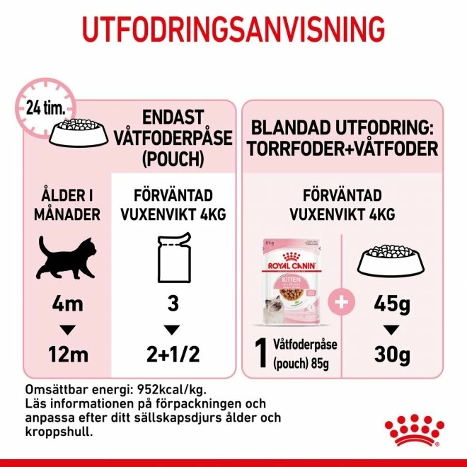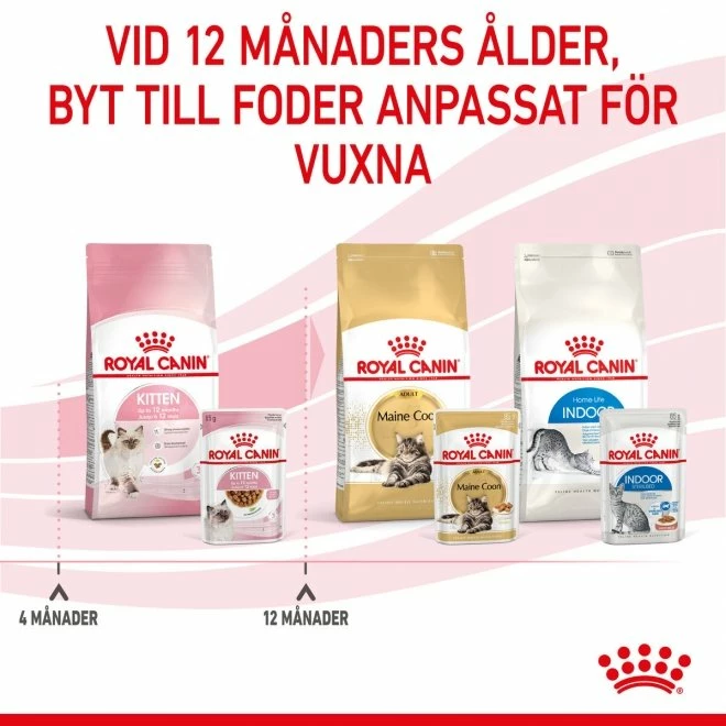 Royal Canin Kitten Instinctive är ett våtfoder för kattungar mellan 4 och 12 månader. Royal Canin Kitten Instinctive hjälper kattungen att utveckla sitt egna immunförsvar under en period när det är fortfarande ömtåligt. Kattungens tänder bryter fram samtidigt som skelettet blir starkare. Royal Canin Kitten Instinctive är speciellt utvecklat för att stimulera kattungarnas aptit, samtidigt som våtfodret innehåller alla de näringsämnen som kattungen behöver för att fortsätta utveckla sitt försvar och skelett. Våtfodrets mjuka konsistens och perfekt anpassade bitar gör det enkelt för kattungarna att äta utan att riskera att få ont i tänderna.