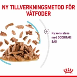Royal Canin Sensory Feel är utformat som ojämna bitar av lite större storlek än i övriga Sensory-serien, och de ligger i en smaklig sås av lite tjockare karaktär. Detta gör att varje delikat tugga varar lite längre!