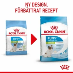Royal Canin X-small Puppy är ett hundfoder speciellt utvecklat för valpar och unghundar upp till 10 månaders ålder som vuxna väger under 4 kg. Royal Canin X-small Puppy är skonsamt för den lilla valpen och bidrar genom sin sammansättning till att skydda valpens mag- och tarmslemhinna och därigenom ge en bättre konsistens på avföringen. Hundfodrets bitar är mycket små och speciellt formade för att tilltala den lilla valpen, samt innehåller ett ämne som hjälper till att förebygga uppkomsten av tandsten. Royal Canin X-small Puppy stödjer den lilla valpens extremt snabba tillväxt genom ett väl anpassat energiinnehåll, samt en optimal sammansättning av kalcium och fosfor för att stärka benstommen. Royal Canin X-small Puppy hjälper den lilla valpen att stärka sitt naturliga immunförsvar, och stärker valpens päls genom tillskott av bland annat omega 3 och omega 6.